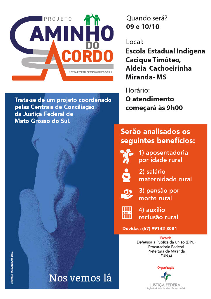 Equipes da Justiça Federal em Mato Grosso do Sul (JFMS), da Defensoria Pública da União (DPU) e da Procuradoria Federal, com o apoio de outros parceiros, irão realizar o mutirão itinerante para atender à população local e promover sessões de conciliação destinadas à concessão de benefícios previdenciários como aposentadoria por idade, salário-maternidade, pensão por morte e auxílio reclusão.