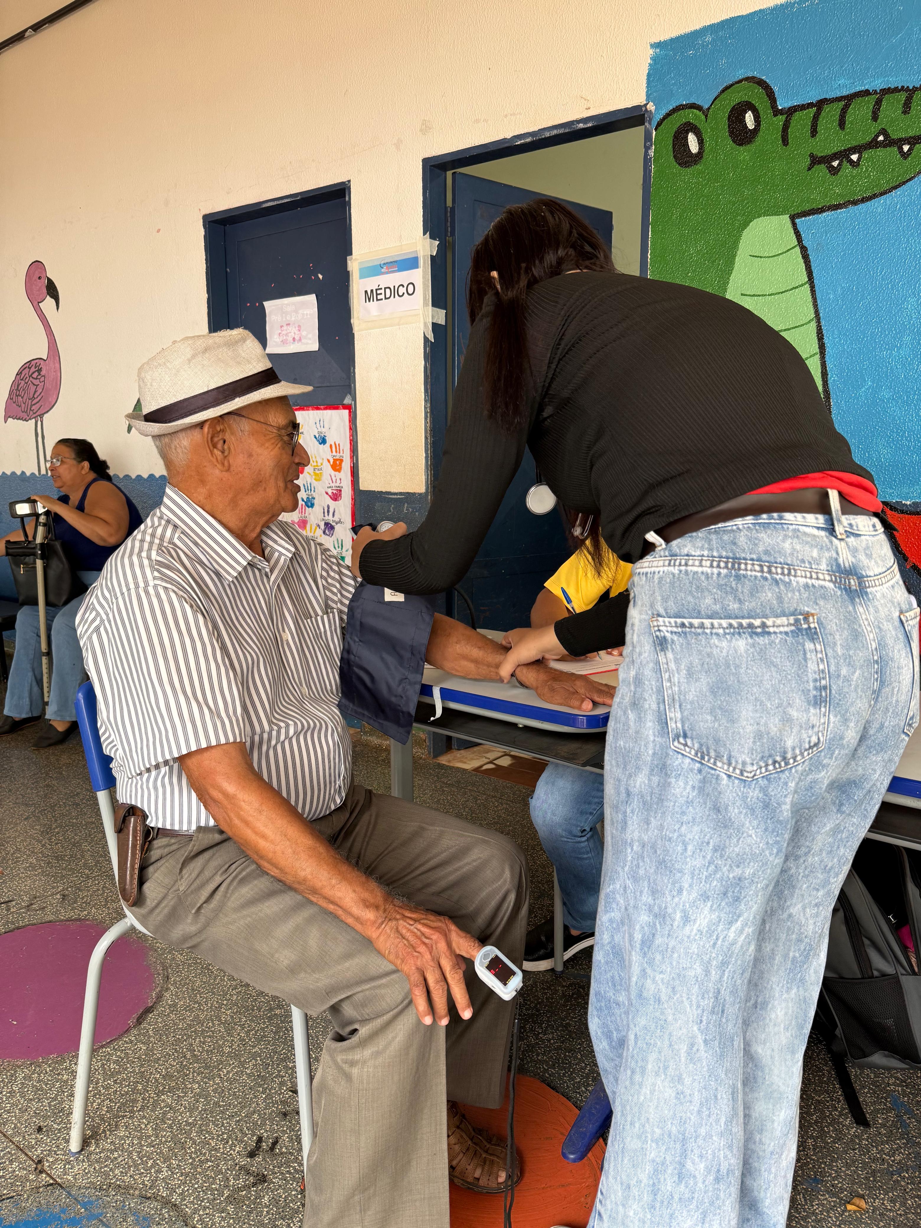 Idoso passa por aferição de pressão, batimentos cardíacos e saturação de oxigênio
