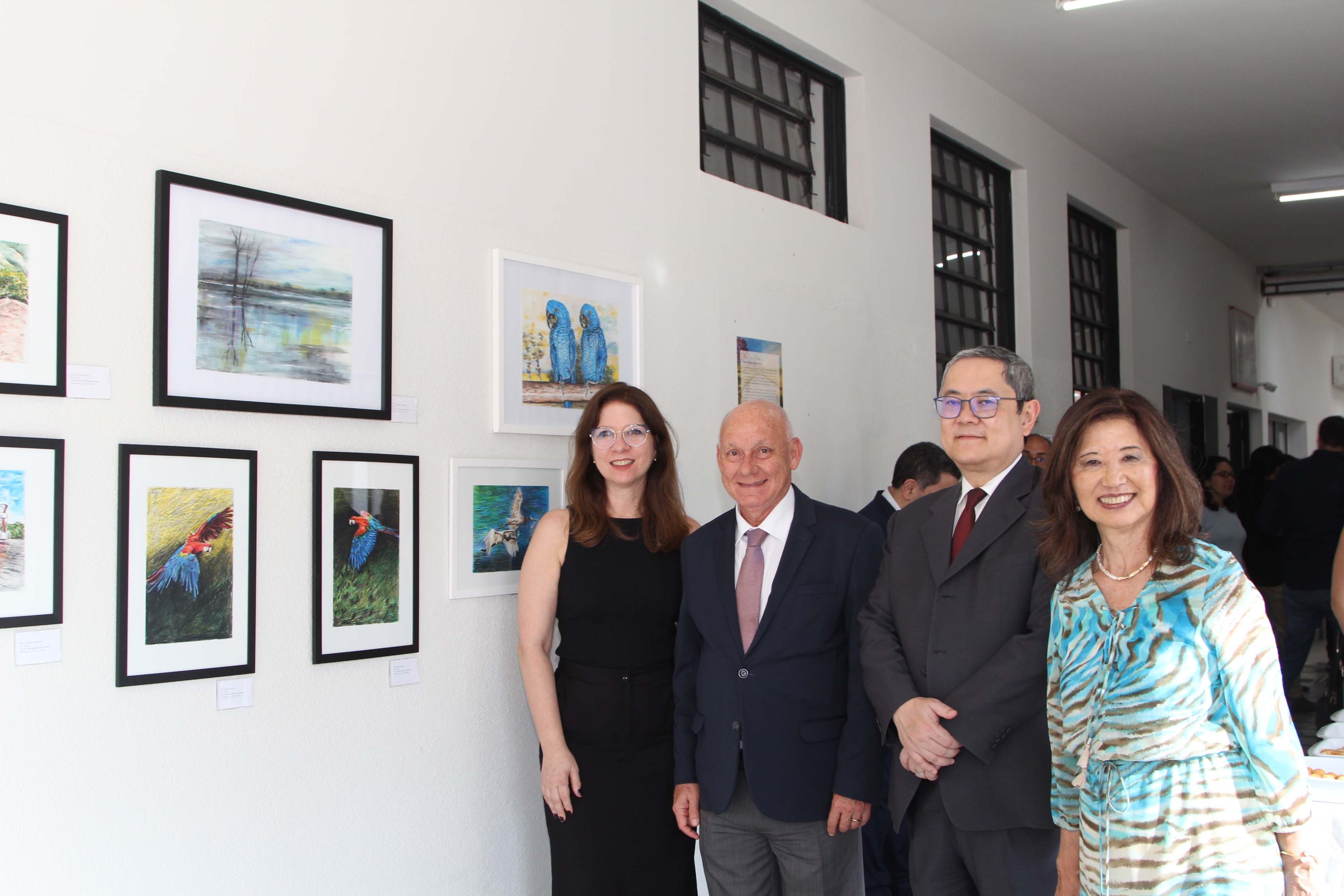 Luciana Fischer, Johonsom di Salvo, Carlos Muta e Consuelo Yoshida ao lado da exposição temporária