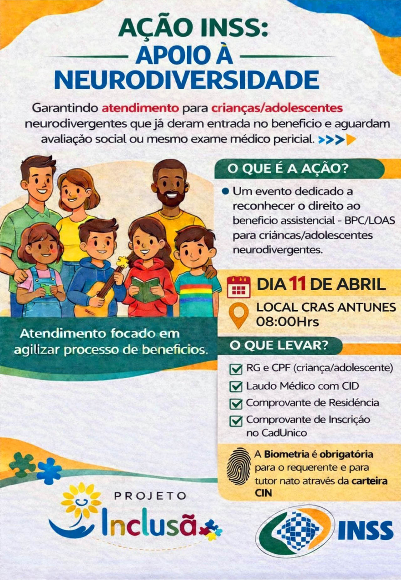 O Projeto Inclusão visa facilitar o atendimento e o reconhecimento do benefício assistencial de prestação continuada (BPC/LOAS) a crianças e adolescentes neurodivergentes, integrantes de famílias em situação de vulnerabilidade social, que já deram entrada no INSS e aguardam avaliação social ou exame médico-pericial. A iniciativa reduz o tempo de espera e assegura dignidade e proteção social aos beneficiários.