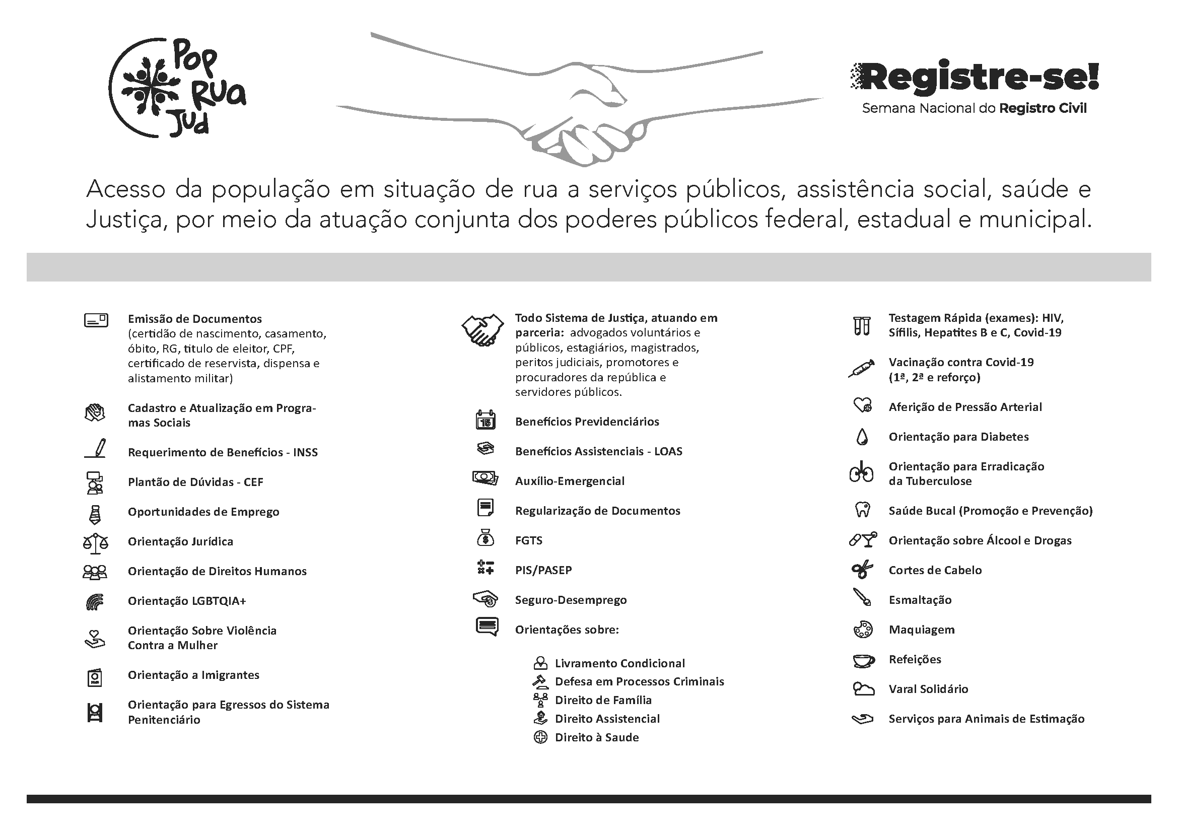 Os programas têm a finalidade de garantir à população em situação de rua e em vulnerabilidade acesso à justiça, serviços públicos de documentação, assistência social e saúde, por meio da atuação conjunta de mais de 30 instituições públicas e organizações da sociedade civil.