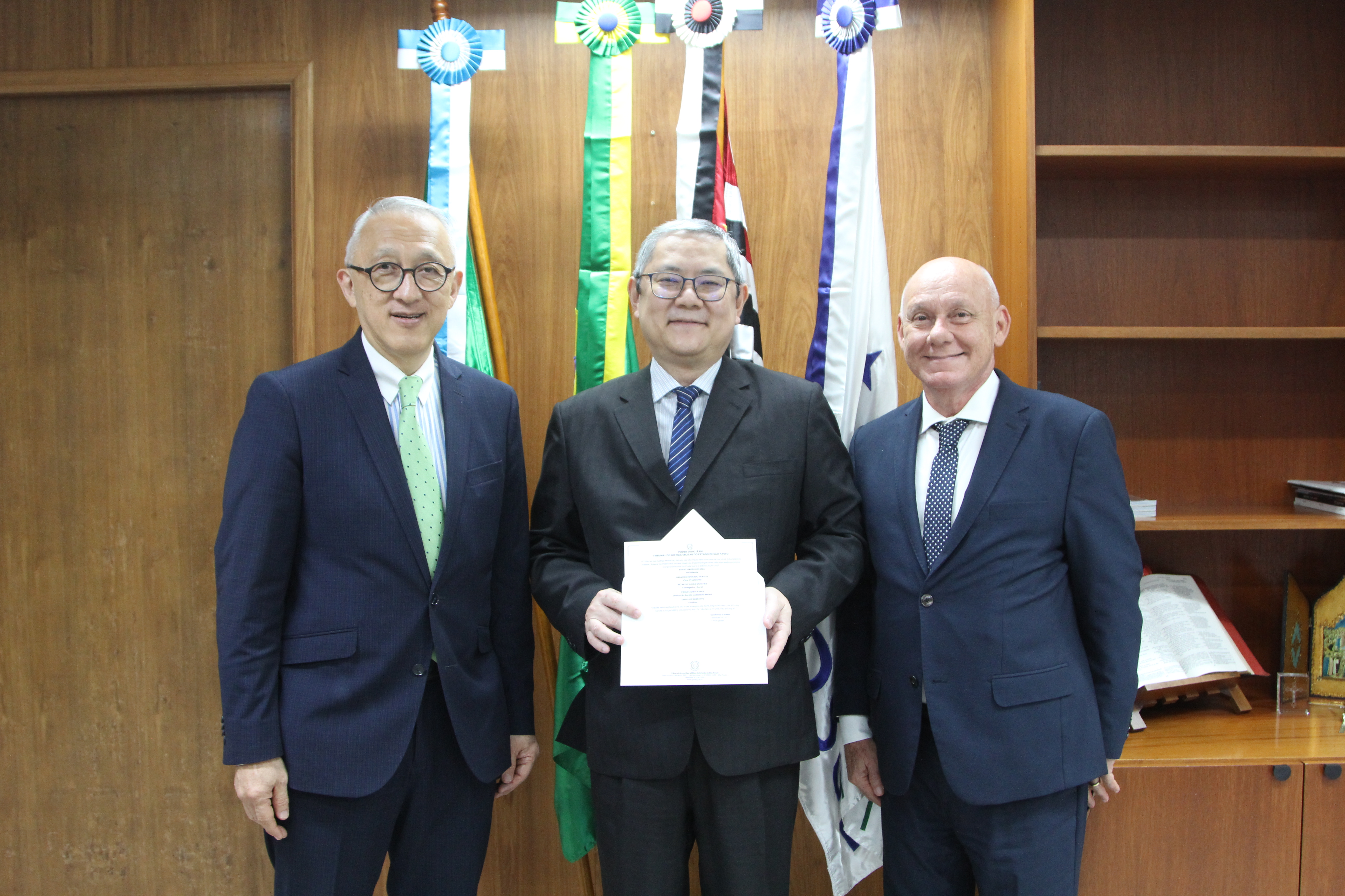 Os desembargadores federais Carlos Muta, presidente do Tribunal Regional Federal da 3ª Região (TRF3), e Johonsom di Salvo, vice-presidente e eleito presidente para o biênio 2026-2027, receberam, no dia 12 de janeiro, o presidente do Tribunal de Justiça Militar do Estado de São Paulo (TJM-SP), desembargador militar Silvio Hiroshi Oyama.