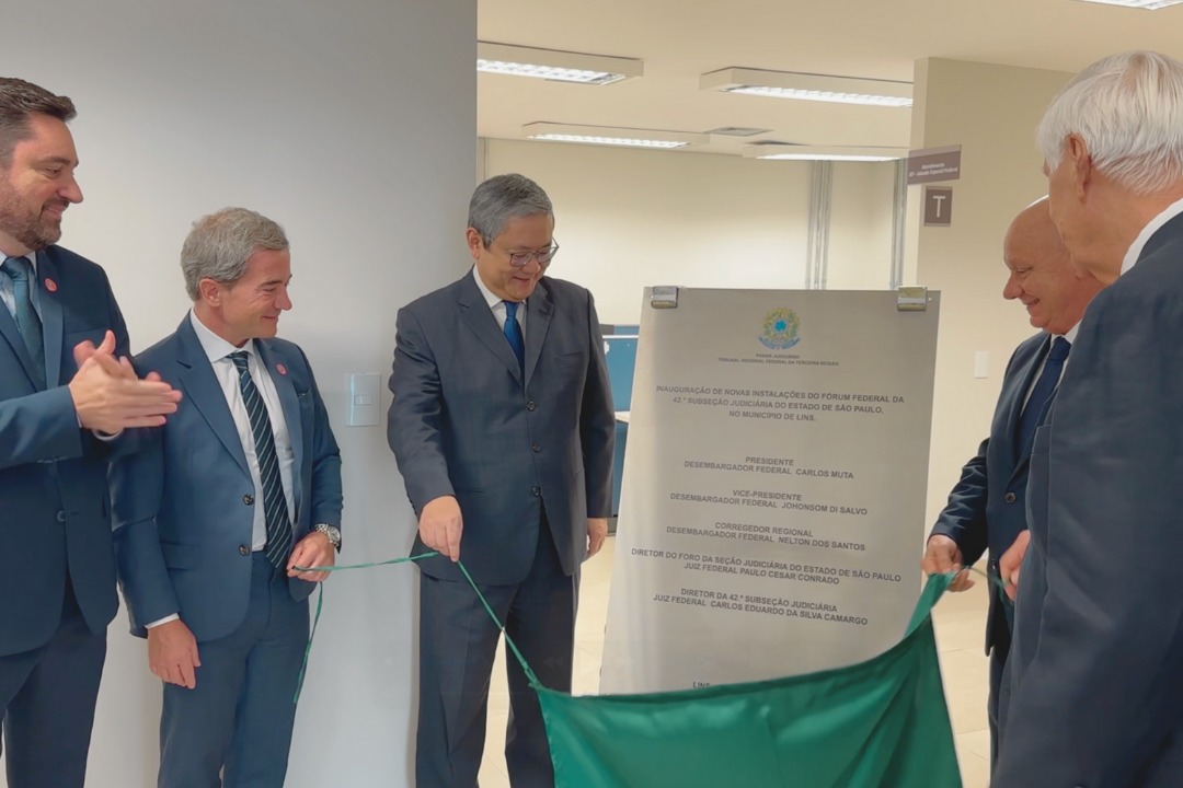 Juiz federal em Lins Fabricio Campos Bortoletto; presidente do TRF3, Carlos Muta; vice-prefeito de Lins, André Luiz Previato Kodjaoglanian; vice-presidente e presidente eleito para o biênio 2026-2028, Johonsom di Salvo; e diretor da 42ª Subseção Judiciária, Carlos Eduardo da Silva Camargo