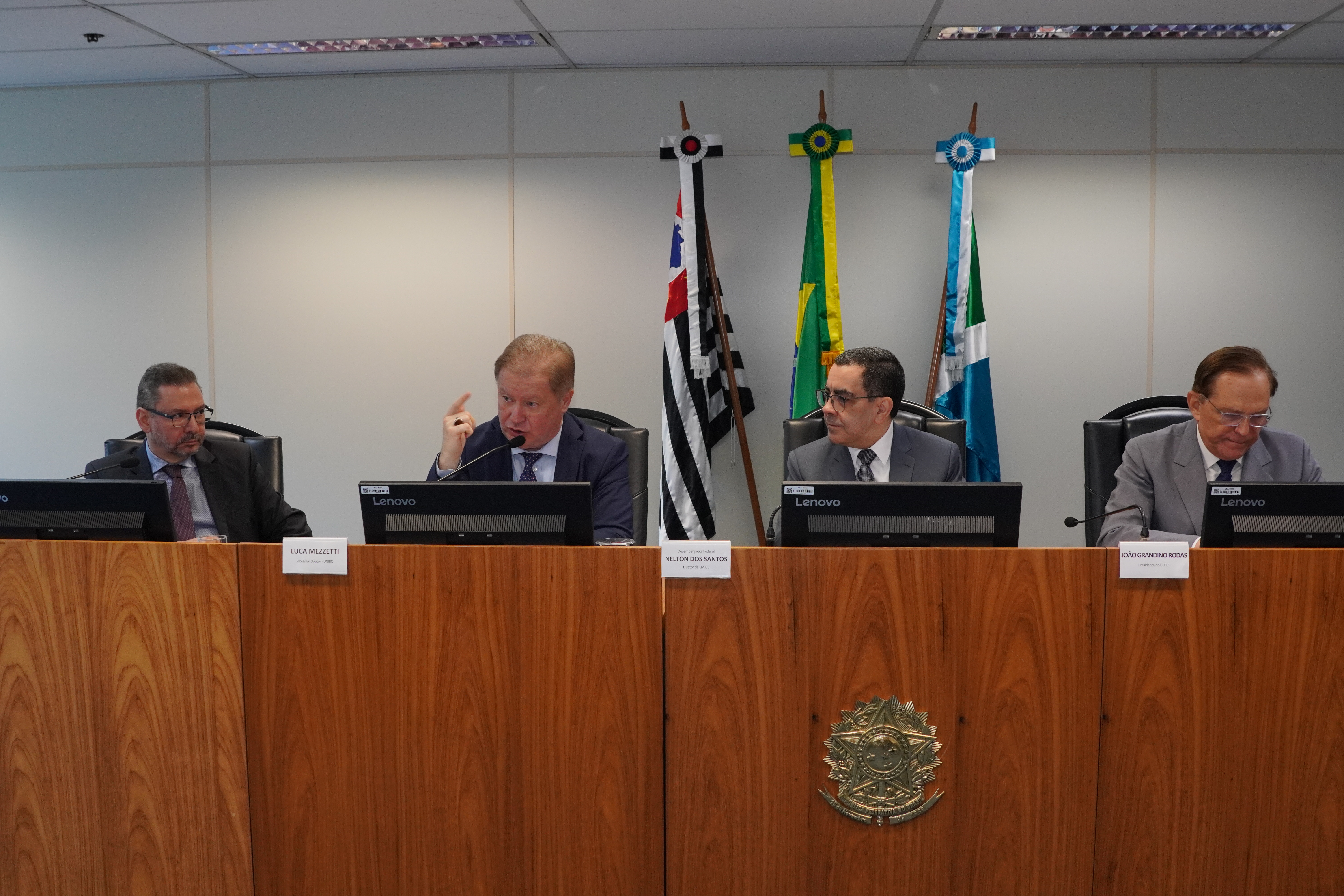 A direção do evento e a condução dos trabalhos ficaram a cargo do diretor da Emag, desembargador federal Nelton dos Santos, que destacou a relevância do debate acadêmico-institucional como instrumento de aperfeiçoamento da prestação jurisdicional e de fortalecimento do Estado Democrático de Direito.